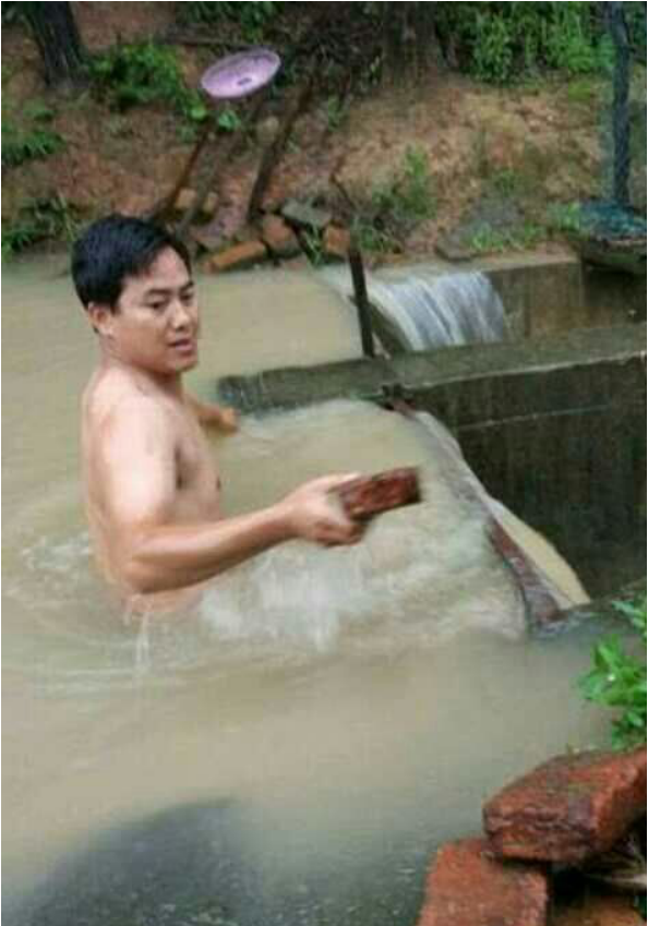 抗洪抢险中的无名英雄,看着越过警戒线的水位线,他跳入水中疏通滤网,成功泄洪。(江西省靖安县纪委)