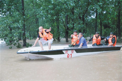 江西省奉新县普降大到暴雨。该县会埠镇群众被困农场,情况十分危急。该县组织公安、消防、武警和应急分队的人员赶往受灾地点,经过一个小时的紧张救援,武警队员成功救出被困老人。(江西省奉新县纪委)