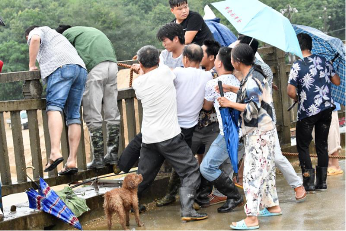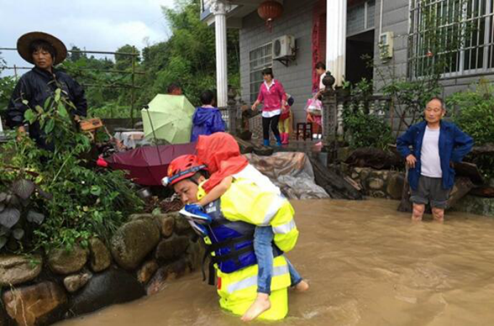 抢险救灾,时间尤为宝贵。提前一分就能挽回更多财产。浙江省开化县建丰村党员干部在洪水上涨前及时将村民转移至安全地带。(浙江省开化县纪委)