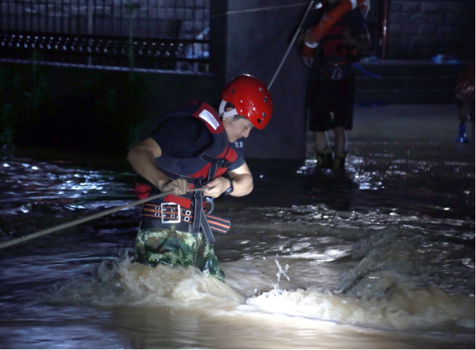大水无情而又猛烈,也有群众因来不及移转而身陷险地。浙江省龙游县小南海镇傅家新村的泽随溪水位暴涨,漫过原有几座桥面近一米,水流湍急。北岸地势较低,原本陆地全成了水域。在冲锋舟无法驶进的情况下,救援人员将自己绑在一根缆绳上,徒步靠近前进,成功救出被困的群众。(浙江省龙游县纪委)