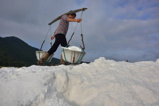 第七步:收盐归坨。当卤水进入最后一个盐池时,就出现白色的盐,等盐在结晶池达到一定的厚度,就可以收盐了。靠海吃海,千百年来,象山的盐民们用勤劳和智慧在一片片滩涂上记录下盐的历史,也书写着各自咸甜相织的生活。