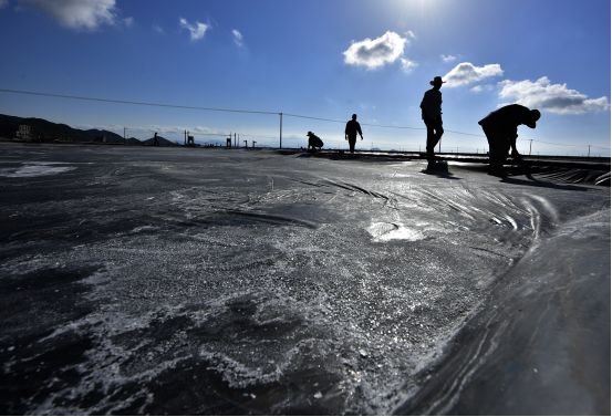 第五步:异常天气处理。晒盐要时刻关心天气预报,在异常天气发生前做好各种防范措施。例如,台风来前要盖好结晶池和已经堆积的盐坨,加固压实等。