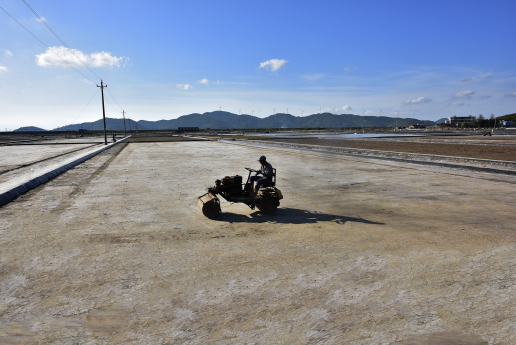 第六步:整滩。盐滩经过长时间海水浸泡,底部泥土会出现松软和空隙,这时就需要跟压路机相似的整滩机进行整滩,把盐池的泥土压硬,这样能提高盐的产量。