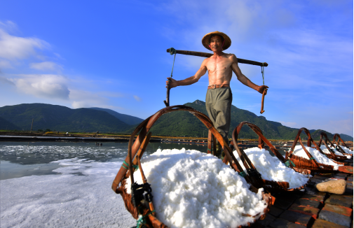浙江象山位于宁波东南,三面环海,是海盐晒制的绝佳场所。在唐代正史中就有了象山产盐的历史记载。制盐方法从元代的刮泥淋卤和泼灰制卤法到板晒法结晶、缸坦晒法结晶,再到现在的平滩晒法。