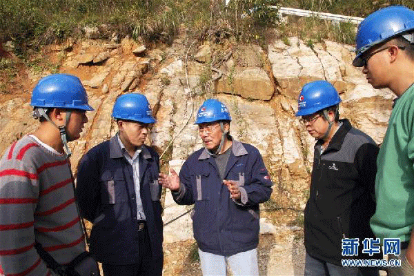南仁东(左二)在大窝凼施工现场指导反射面单元拼装工作(2015年11月25日摄)。新华社发(中科院国家天文台供图)