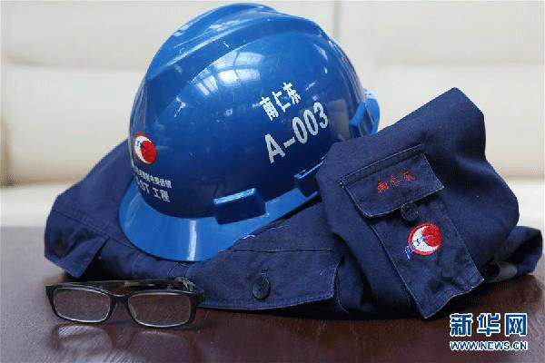 南仁东使用过的安全帽、工作服被工作人员保存在FAST项目控制中心内(2017年9月19日摄)。新华社记者 刘续 摄
