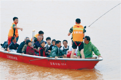 6月25日,江西省丰城市梅林镇泉汪村防汛抢险救援人员用冲锋舟转移被困人员。灾情发生后,该市启动紧急应急响应,派出党员干部、消防官兵、城管队员共计60余人,抢险冲锋舟两艘,将被困村民全部成功转移。(江西省丰城市纪委)
