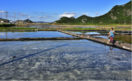 第七步:收盐归坨。当卤水进入最后一个盐池时,就出现白色的盐,等盐在结晶池达到一定的厚度,就可以收盐了。靠海吃海,千百年来,象山的盐民们用勤劳和智慧在一片片滩涂上记录下盐的历史,也书写着各自咸甜相织的生活。