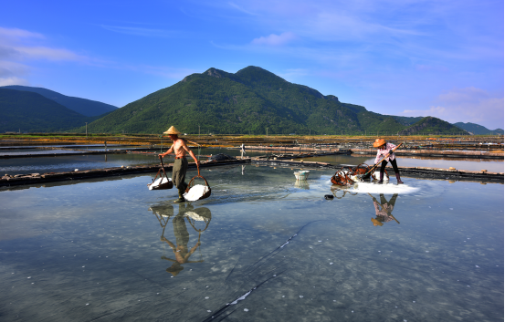 浙江象山位于宁波东南,三面环海,是海盐晒制的绝佳场所。在唐代正史中就有了象山产盐的历史记载。制盐方法从元代的刮泥淋卤和泼灰制卤法到板晒法结晶、缸坦晒法结晶,再到现在的平滩晒法。
