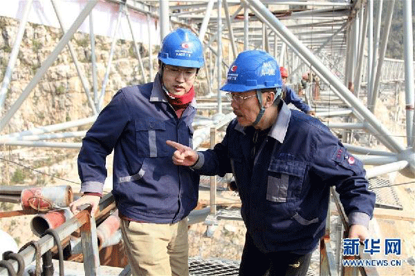 南仁东(左二)在大窝凼施工现场指导反射面单元拼装工作(2015年11月25日摄)。新华社发(中科院国家天文台供图)