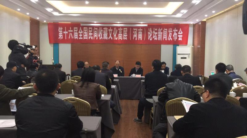 2017年10月31日上午,第十六届全国民间收藏文化高层(河南)论坛新闻发布会在郑州举行,出席本次新闻发布会的领导有中国收藏家协会常务副会长兼秘书长杨晋英,郑州市文广新局局长宋建国,河南省收藏家协会会长丰兴运,郑州市文广新局文化市场处处长李学伟,河南省收藏家协会常务副会长王金平,常务副会长兼秘书长韩宜平、副会长王安乐、赵洪侠、徐斌等也出席了本次新闻发布会。新闻发布会由河南省收藏家协会常务副会长兼秘书长韩宜平主持。