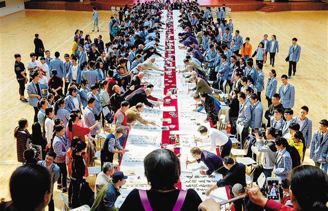 10月30日,由九龙坡区委宣传部、重庆市书协主办的“学习宣传十九大·百名书家百米卷”活动在杨家坪中学体育馆举行。活动现场,100名书法家和书法爱好者,共同书写党的十九大报告精彩、经典内容100句,形成了100米书法长卷。